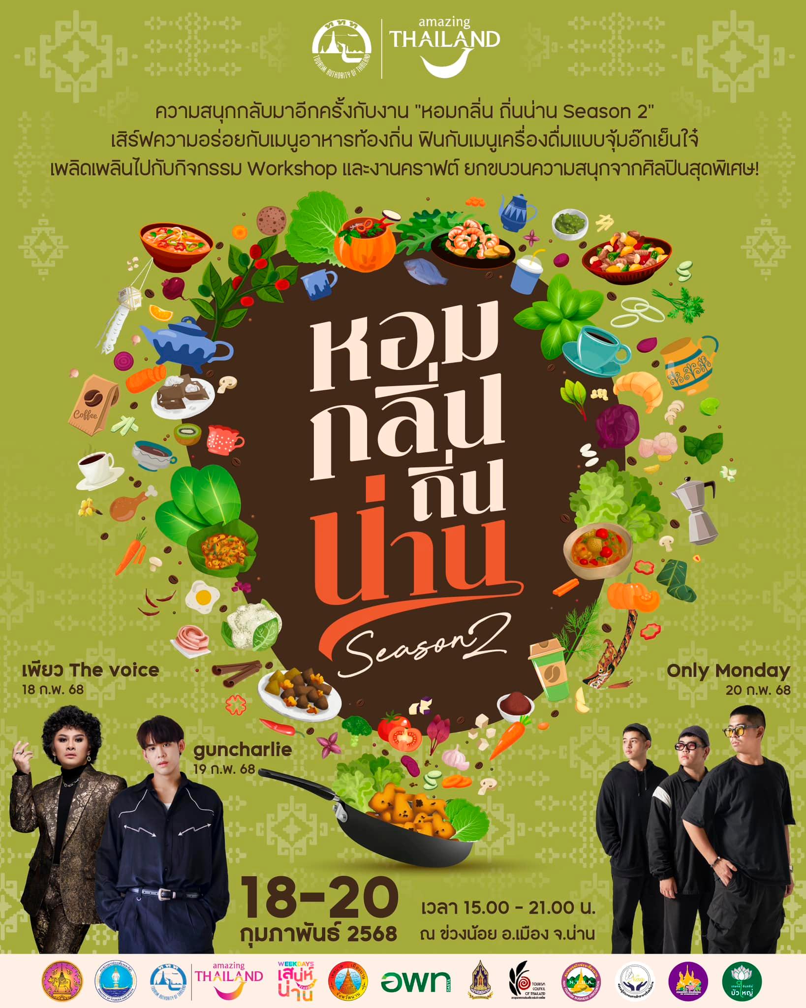 เตรียมพบกับความสนุกอีกครั้งกับงาน "หอมกลิ่น ถิ่นน่าน Season 2" ที่จะจัดขึ้นระหว่างวันที่ 18-20 กุมภาพันธ์ 2568 ณ ข่วงน้อย อ.เมือง จ.น่าน ตั้งแต่เวลา 15.00-21.00 น.