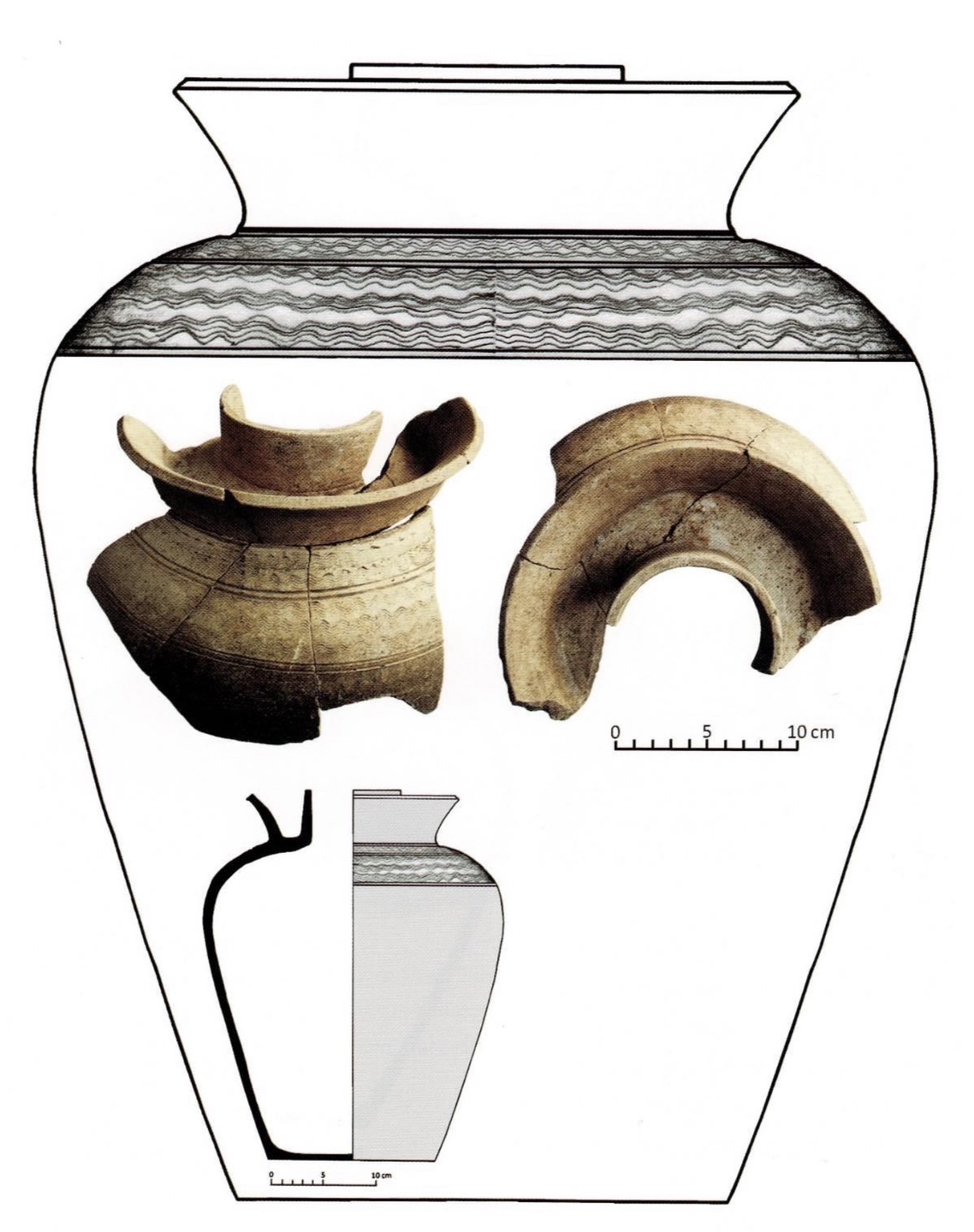 ไหกับหรือไหของปากสองชั้น แหล่งเตาไหแช่เลียง (บ่อสวก) ตกแต่งด้วยลวดลายขูนขีด