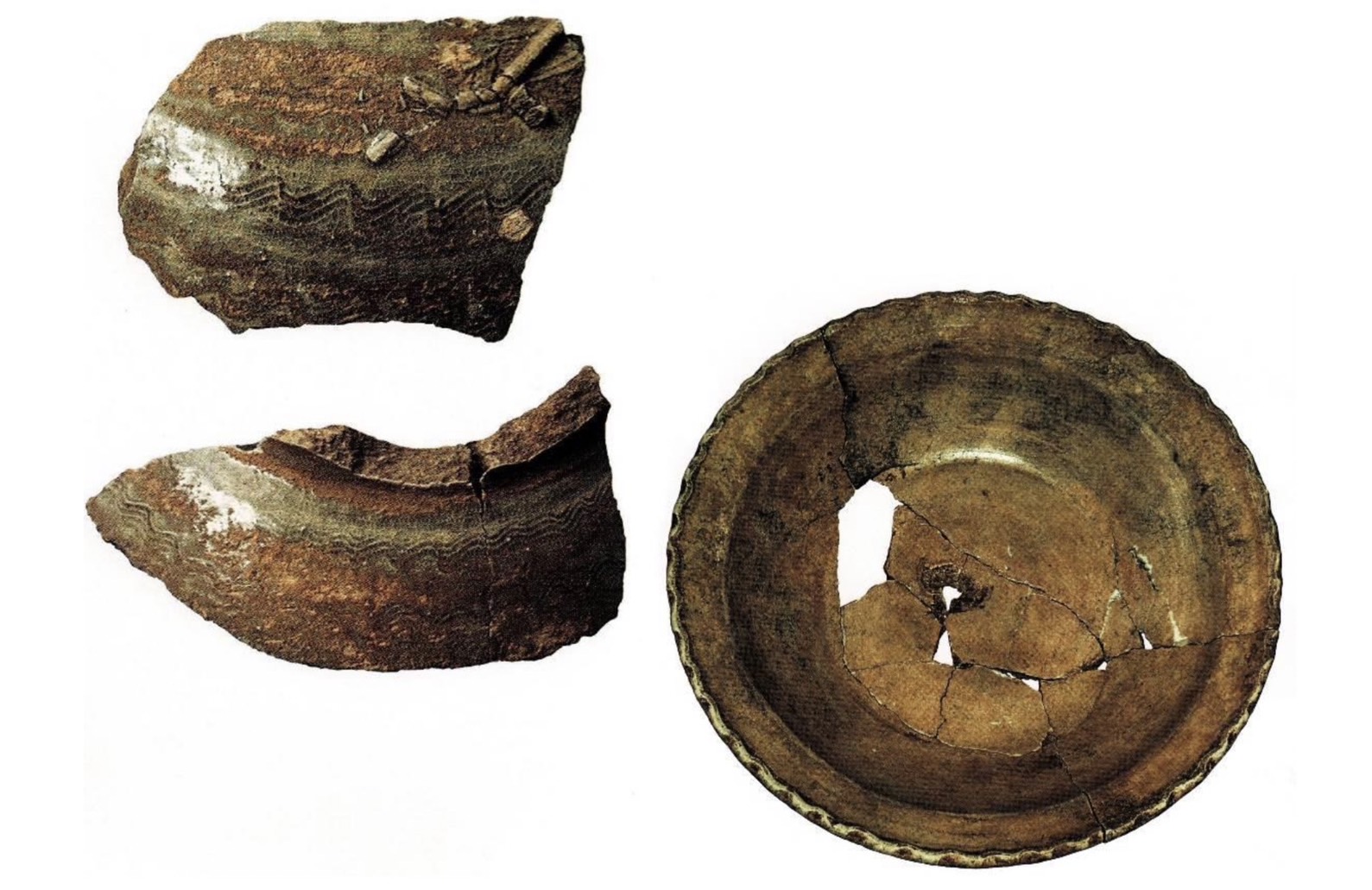 เครื่องเคลือบยุคแรก เป็นภาชนะดินเผาเนื้อแกร่งประเภทจาน ชาม และไห ส่วนใหญ่เป็นเครื่องเคลือบสีเขียว เคลือบมีลักษณะแตกลาน ไม่ประณีตนัก