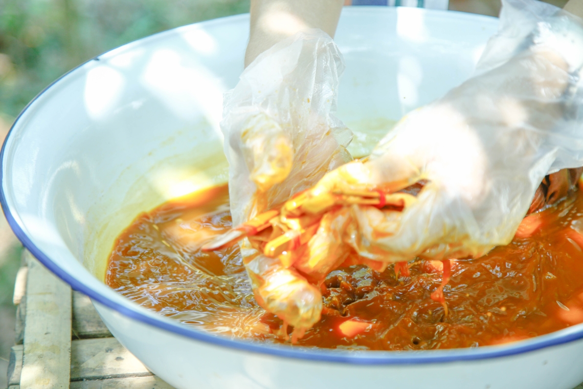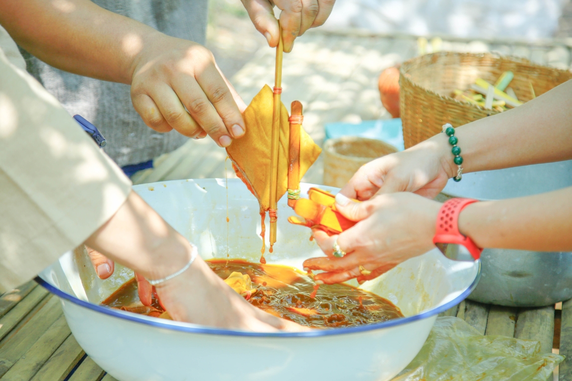 Experience: Dyeing Fabric, Protecting Nature At the heart of this activity lies “Kamin”, also known as Turmeric—a local herb that the Bo Suak people have used for food, herbal medicine, and fabric dyeing for generations. The process begins by washing, grinding, and extracting juice from fresh turmeric. White cloth, tied into desired patterns, is then soaked in the turmeric water for only 15-20 minutes. Beautiful colors gradually emerge on the fabric, reflecting local wisdom and a commitment to environmental preservation.
