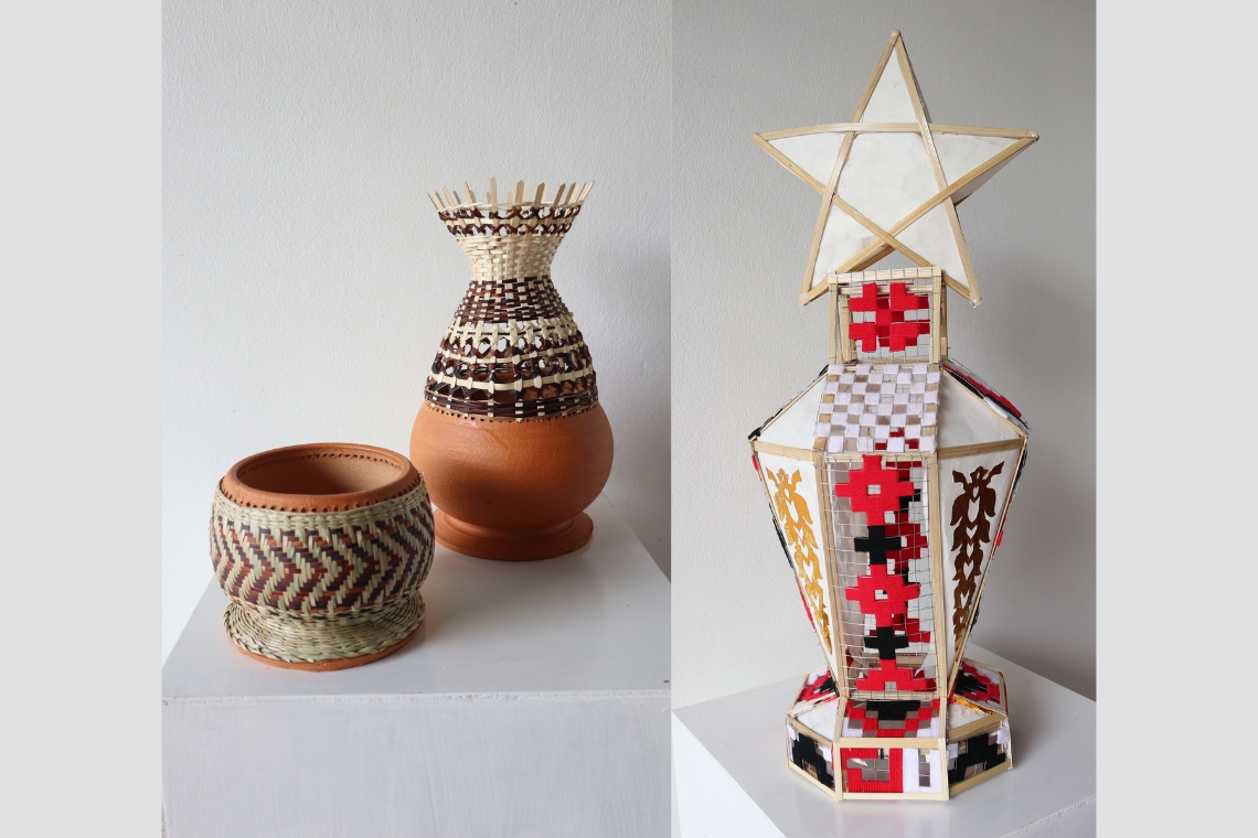 His works reflect his dedication to connecting the way of life and wisdom of Lanna people. This includes collaborations with artisans from other cities, such as lamps that blend the styles of Nan's Ngeow lanterns and Chiang Rai's star lanterns, decorated with Chiang Saen patterns and the Chedi of Wat Phra That Chae Haeng, symbols of both Nan and Chiang Rai. Another collaboration involves a base inspired by "Mok Ran" or "Mok Ran Phra Ruang" pottery, topped with woven elements using materials from Ban Huai Hat - Lak Lai in Nan province. These works convey the intention to preserve handicrafts and folk arts, as well as demonstrate the strong bond between Nan and Sukhothai, resulting in crafts that merge the arts of two cities, driven and supported by the Designated Areas for Sustainable Tourism Administration (DASTA).