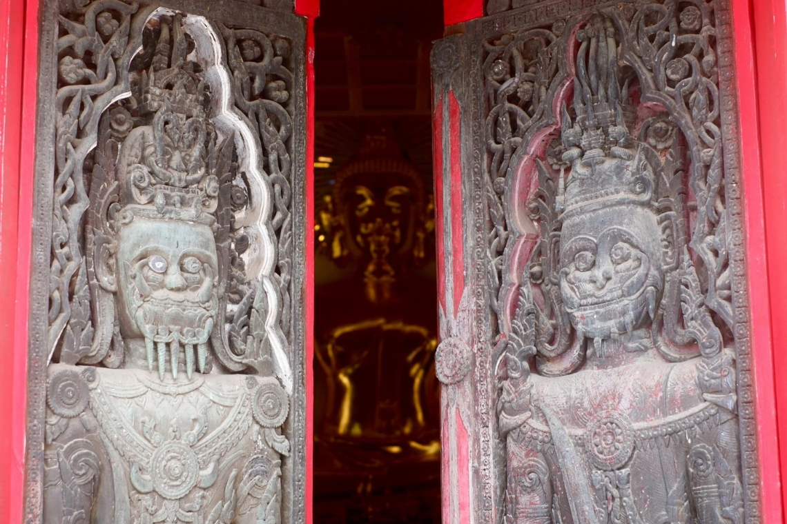 The two Yaksha guardian figures carved on the door express power and protection, symbolizing the safeguarding of religion and the city from various dangers. This door is more than just an entrance to the vihara—it is a window that opens to the beauty of Nan's local art and culture.