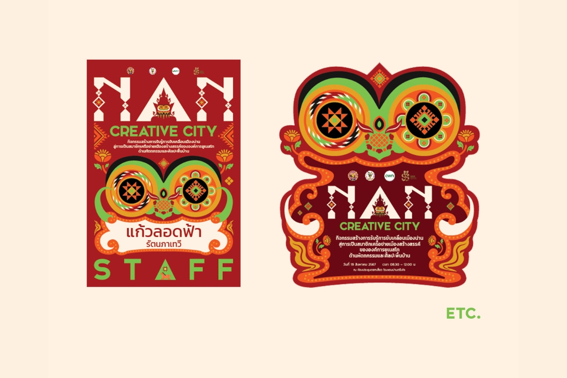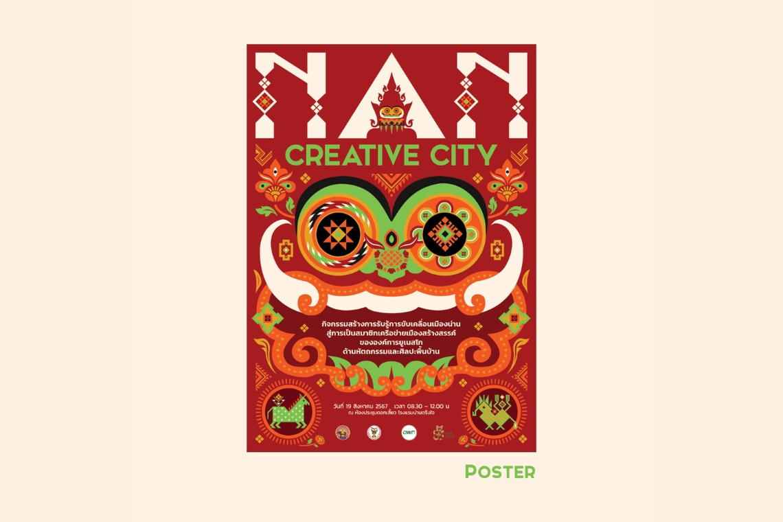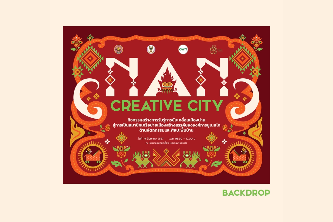 The carved wooden door of the Yaksha guardians at Wat Phaya Phu has become an important source of inspiration in graphic design used in activities aimed at educating and understanding Nan's journey towards becoming a member of the UNESCO Creative Cities Network. These designs, used in stage backdrops, event backdrops, program book covers, and posters, reflect the blend of local culture, creativity, and the craftsmanship of Nan designers. Due to positive feedback, these graphics will be used in other activities throughout the province.
