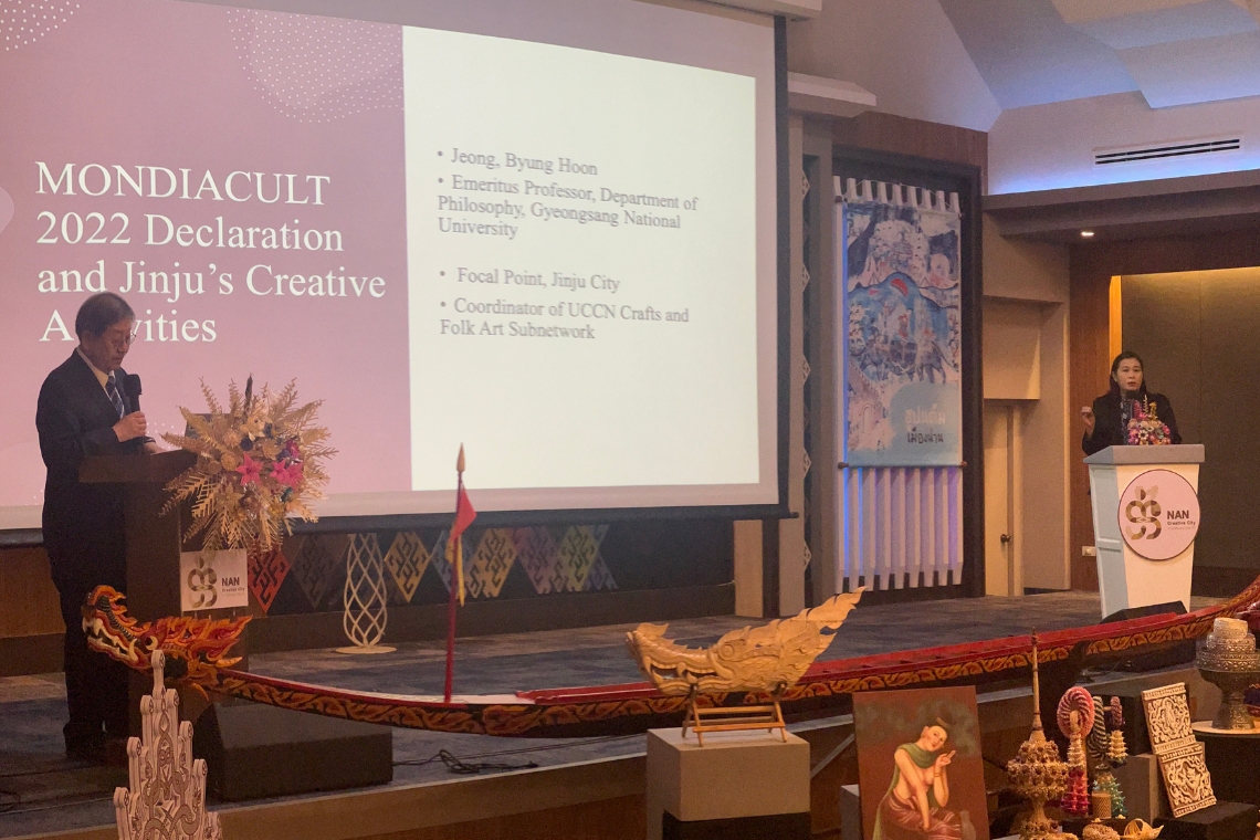 1. Prof. Dr.Byung Hoon Jeong จาก Jeonbuk National University ผู้เชี่ยวชาญด้าน Crafts and Folk Art ได้บรรยายในหัวข้อ “The MONDIACULT 2022 Declaration and Creative Activities of Jinju” โดยนำเสนอทิศทางและนโยบายที่เกี่ยวข้องกับเครือข่ายเมืองสร้างสรรค์ในระดับนานาชาติ รวมถึงประสบการณ์และความสำเร็จของเมือง Jinju สาธารณรัฐเกาหลี ซึ่งเป็นเมืองสร้างสรรค์ด้านหัตถกรรมและศิลปะพื้นบ้านของยูเนสโก