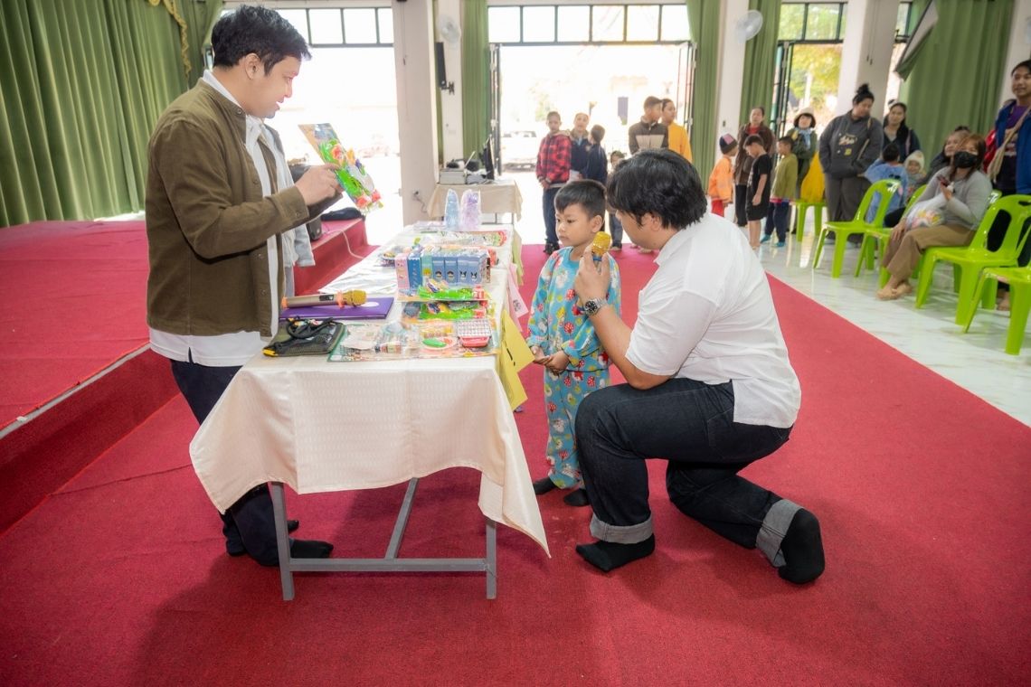 เมื่อถึงเวลาแจกของรางวัล แถวเด็กๆ จะยาวขึ้นทันที การย่อตัวลงคุยให้เท่าระดับสายตาเด็กๆ ทำให้เราเห็นความเขินอายและความตื่นเต้นที่ปิดไม่มิด วงล้อเสี่ยงโชคกลายเป็นเครื่องมือที่สร้างเสียงหัวเราะพร้อมกันทั้งศาลา และสอนเรื่องการรอคิวแบบธรรมชาติที่สุด โดยไม่ต้องมีคำพูดสอนระเบียบวินัยมากมาย แค่มีพื้นที่ให้ได้รอ ได้ลุ้น และได้ยินเสียงเพื่อนดีใจ เด็กๆ ก็ซึมซับสิ่งเหล่านั้นไปเอง