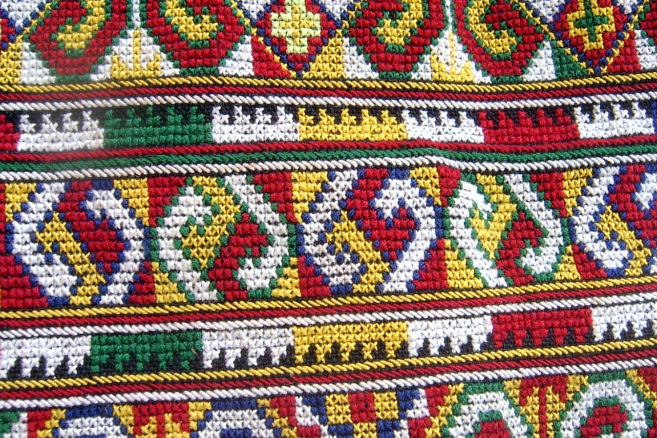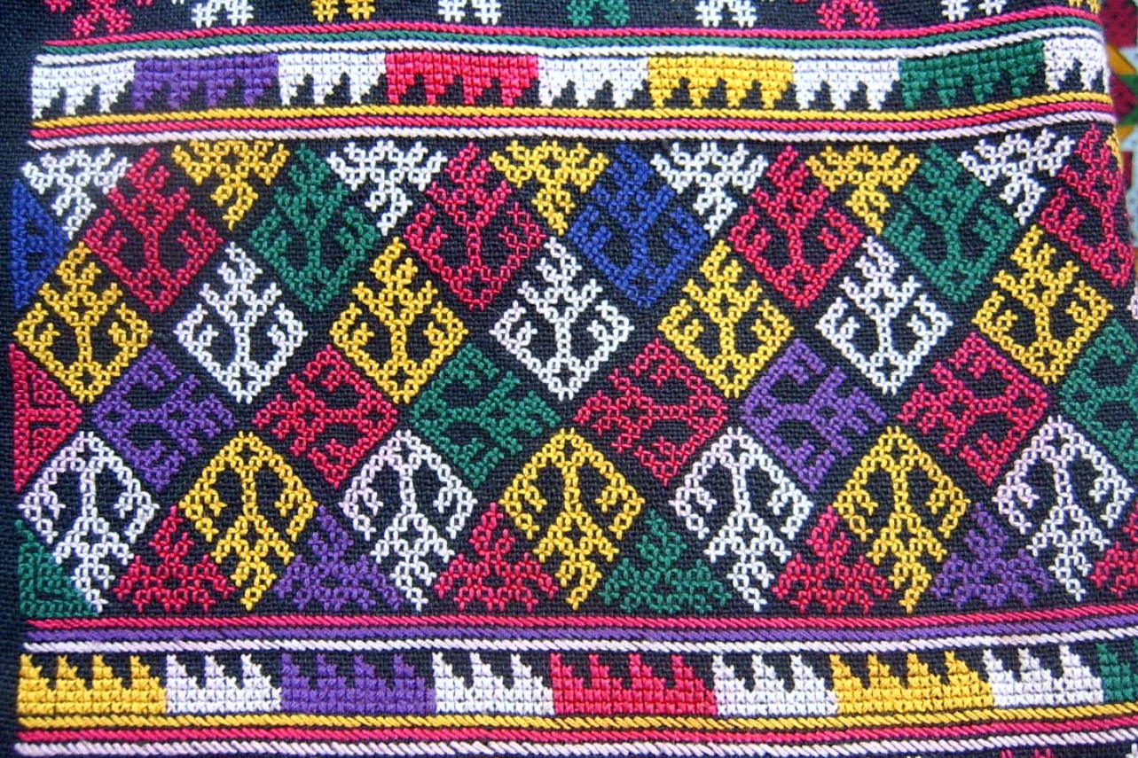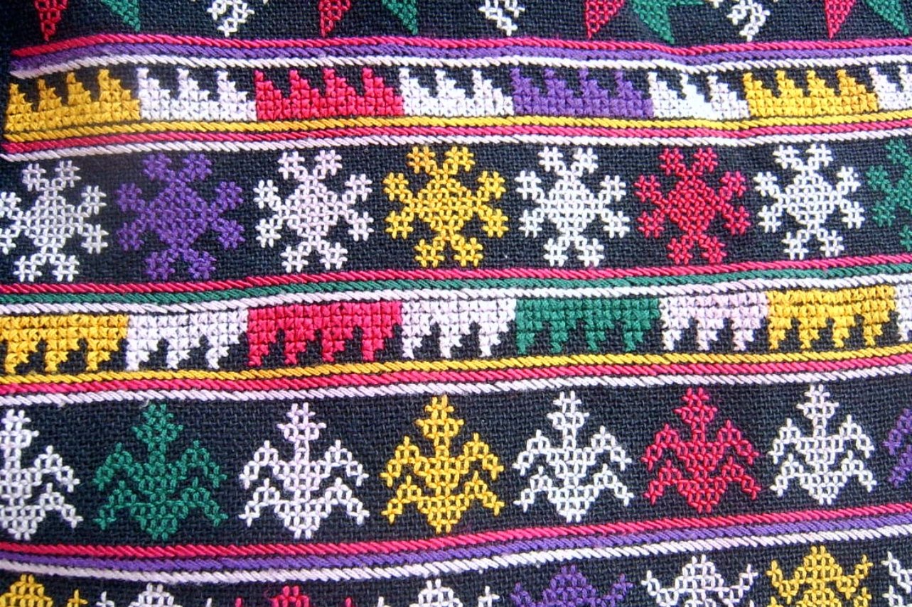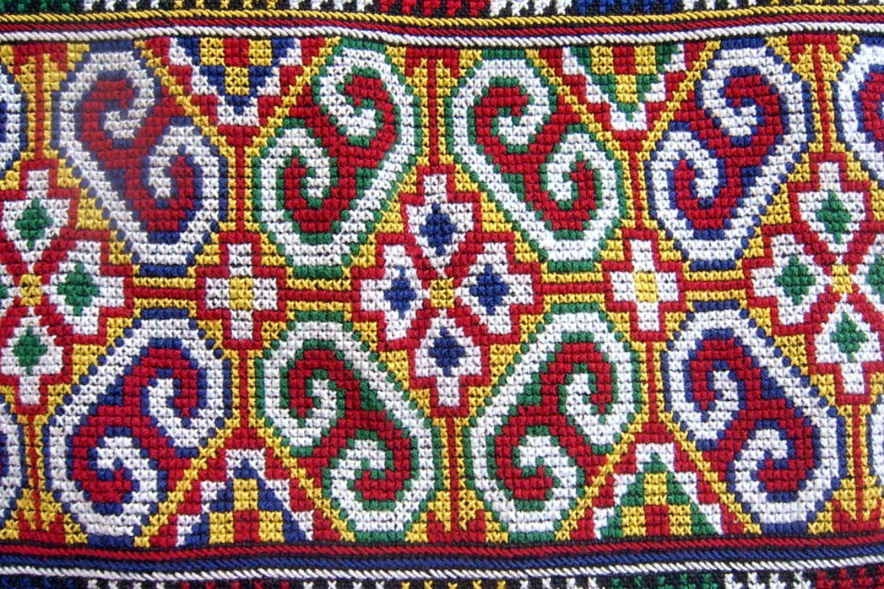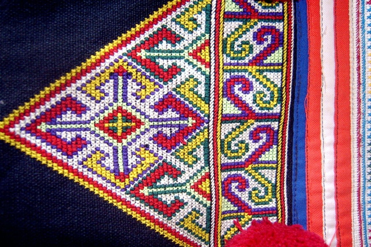 โฉ่ง เกียม (การปักลายขัด): งานคราฟต์ที่ลอกเลียนเทคนิคการทอผ้ามาไว้บนเข็ม มักใช้สีเดียวเพื่อเน้นความคมชัด