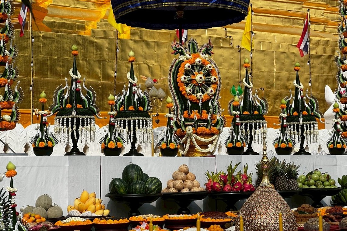 ภาพเครื่องบวงสรวงที่จัดวางอย่างอลังการตรงหน้า คือบทพิสูจน์ชั้นดีของความประณีต เราเห็น บายศรี ทรงสูงที่ประดิษฐ์จากใบตองและดอกไม้สดที่ถูกพับและจีบอย่างมีระเบียบ ทุกองศาของริ้วตองคือความตั้งใจที่ต้องใช้สมาธิขั้นสูง