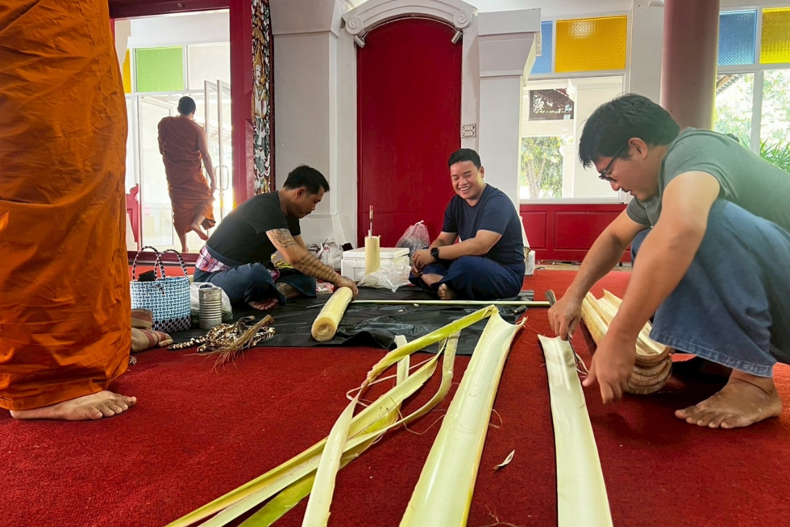 จังหวะของดอกตะล่อม การนำดอกบานไม่รู้โรย (ดอกตะล่อม) หรือดอกรัก มาเสียบลงบนหยวกกล้วยทีละดอกจนเต็มพุ่ม คือการทดสอบความเพียรในระดับมหาศาล ช่างต้องคำนวณระยะห่างและการไล่เฉดสีให้ดูราวกับพุ่มดอกไม้นั้นผลิบานออกมาจากหยวกกล้วยจริง ๆ