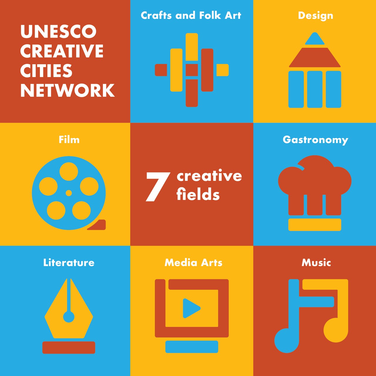 Local level and actively cooperating at the international level, in line with the 2030 Agenda for Sustainable Development and the New Urban Agenda.The UNESCO Creative Cities Network covers seven creative fields: Crafts and Folk Art, Design, Film, Gastronomy, Literature, Media Arts and Music. While cities from a same creative field collaborate intensely to develop joint partnerships, all member cities are also working transversally, in particular at common gatherings such as international meetings or the Network’s Annual Conferences.